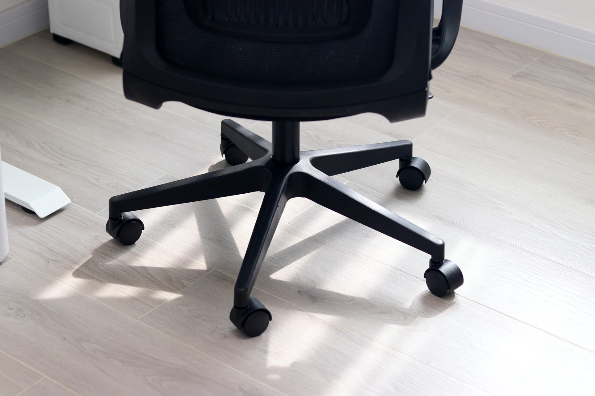 這款椅子的萬向輪采用的是輕音低噪的萬向輪,剛開始用的時候,可能會有一點干澀的感覺,但多使用幾次就會發現它會變得相當順滑,確實表現不錯。再配合這個一體成型的五星尼龍腳,完全不用擔心承重力的問題。