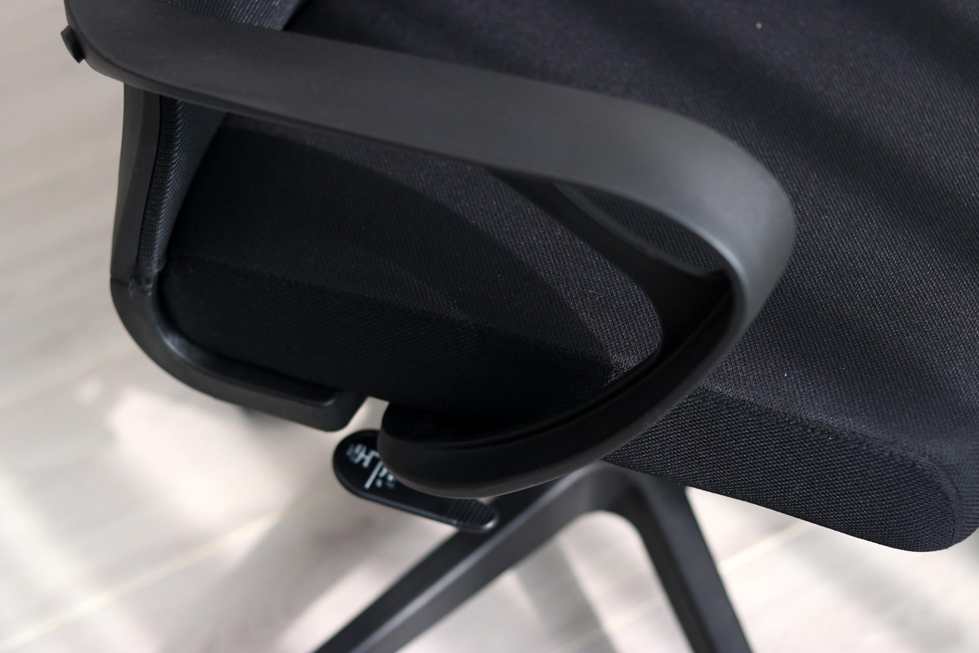 比如扶手部分就不支持調節,而是采用了一體成型的設計。但是整體還是比較有設計感的,而且它本身是有一個傾斜的角度,所以平常坐著辦公的話還是比較的舒適。它的這個扶手高度偏低,如果你平常辦公室喜歡把手靠在扶手上的話,那這款椅子可能沒辦法滿足你。