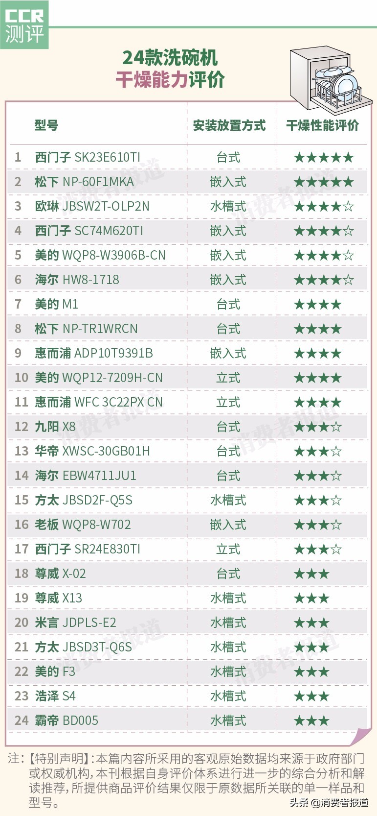 結果顯示,西門子、松下、海爾等4款洗碗機清潔能力得到5星評價,其中嵌入式、立式洗碗機的洗凈效果總體表現良好,能將餐具清洗的較徹底。