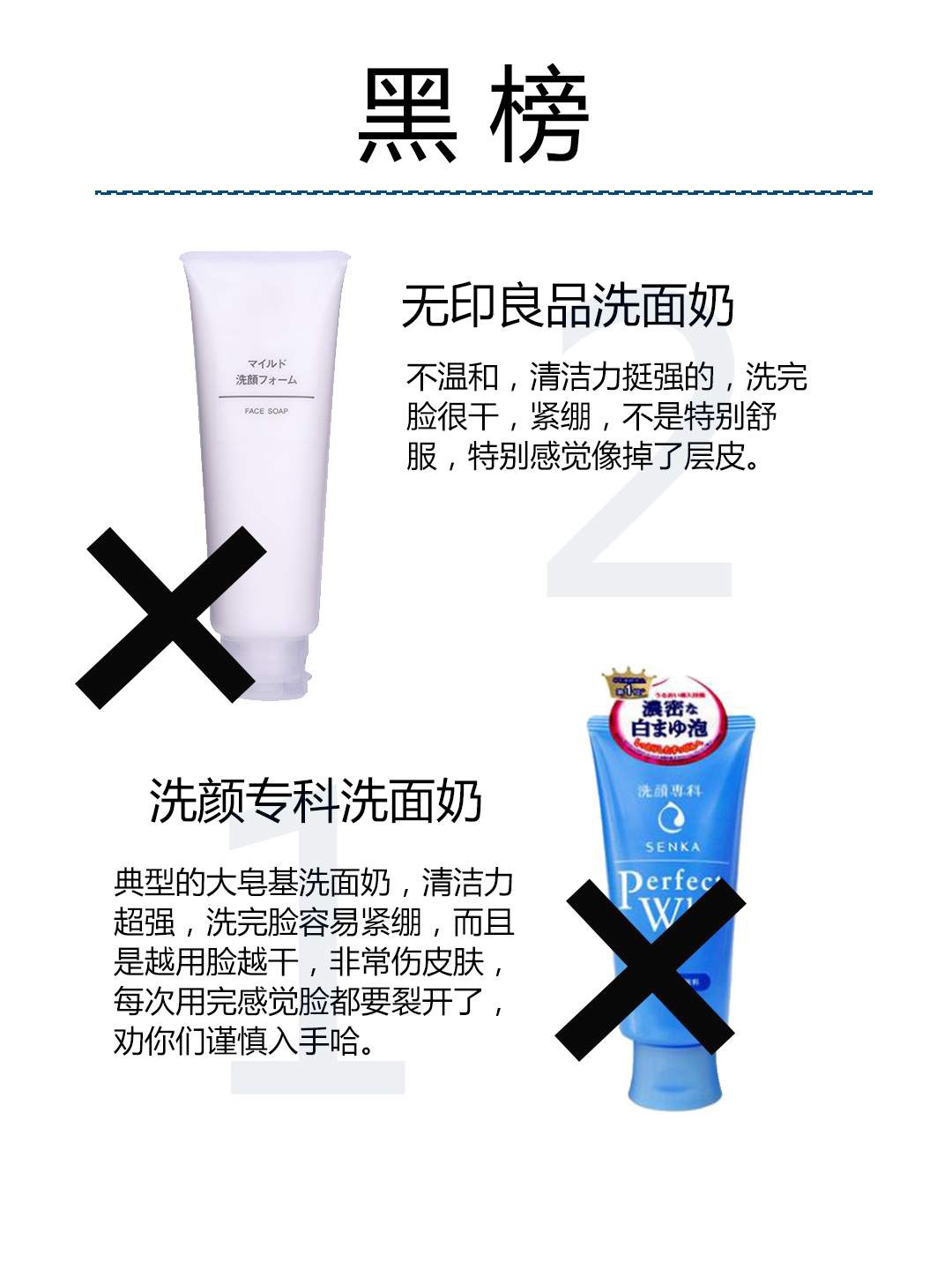 黑榜中的洗面奶有:無印良品洗面奶、資生堂洗顏專科、悅詩風(fēng)吟洗面奶、絲塔芙洗面奶、石澤研究所泡沫潔面乳、泰國牛奶洗面奶