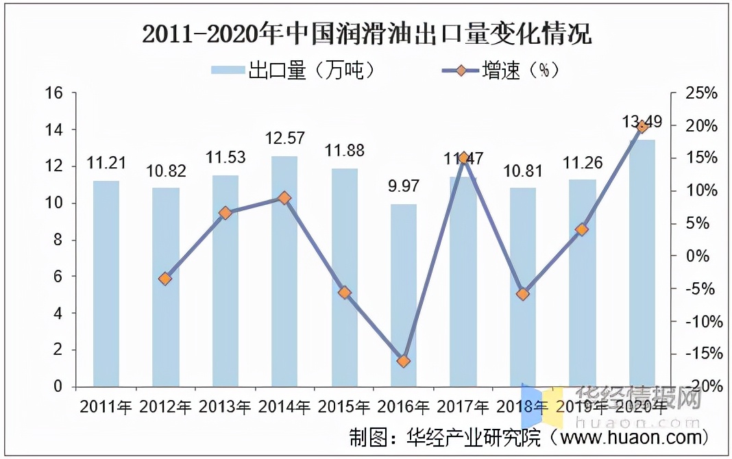根據數據顯示,2011-2020年中國潤滑油出口量呈現震蕩上升的趨勢,其中出口量最低的為2016年,出口量為9.97萬噸。到2020年中國潤滑油出口量上升至13.49萬噸,同比上升19.8%。2020年出口量的大幅上升,受到新冠疫情的影響較大。