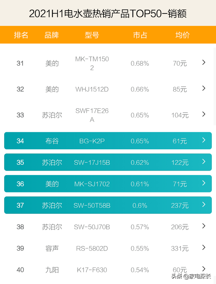 2021年上半年,電熱水壺TOP50熱銷機(jī)型,銷售額榜單中,美的上榜16個(gè)、蘇泊爾14個(gè)、九陽(yáng)5個(gè)、小米5個(gè)、小熊3個(gè),其它品牌7個(gè)。
