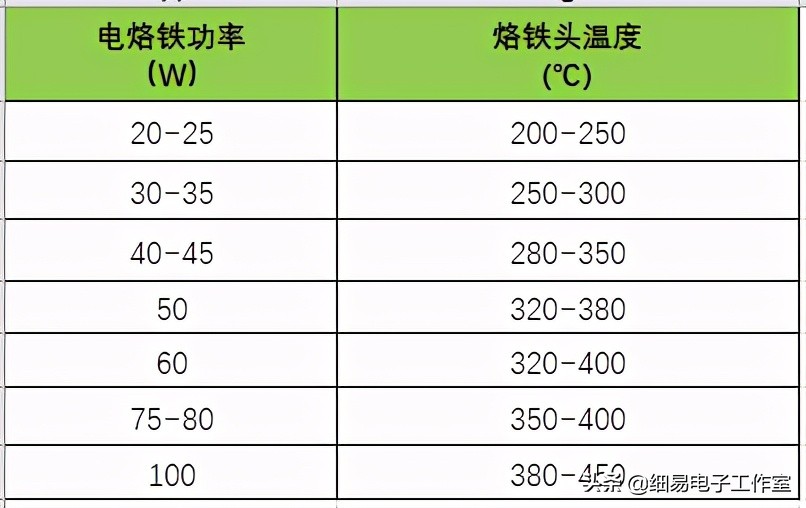 外熱式電烙鐵的烙鐵頭是安裝在發熱芯內部的,其發熱效率低,升溫慢,功率大,適合家用電器、電源等大型產品的焊接;內熱式電烙鐵的發熱芯是安裝在烙鐵頭內部的,其發熱效率高,升溫快,功率小,適合數碼消費類產品的焊接。電烙鐵的常見功率有20W、25W、35W、45W、50W、60W、75W、100W等,其功率越大,烙鐵頭的溫度也就越高,電烙鐵的功率和烙鐵頭溫度的對應關系如下表所示:
