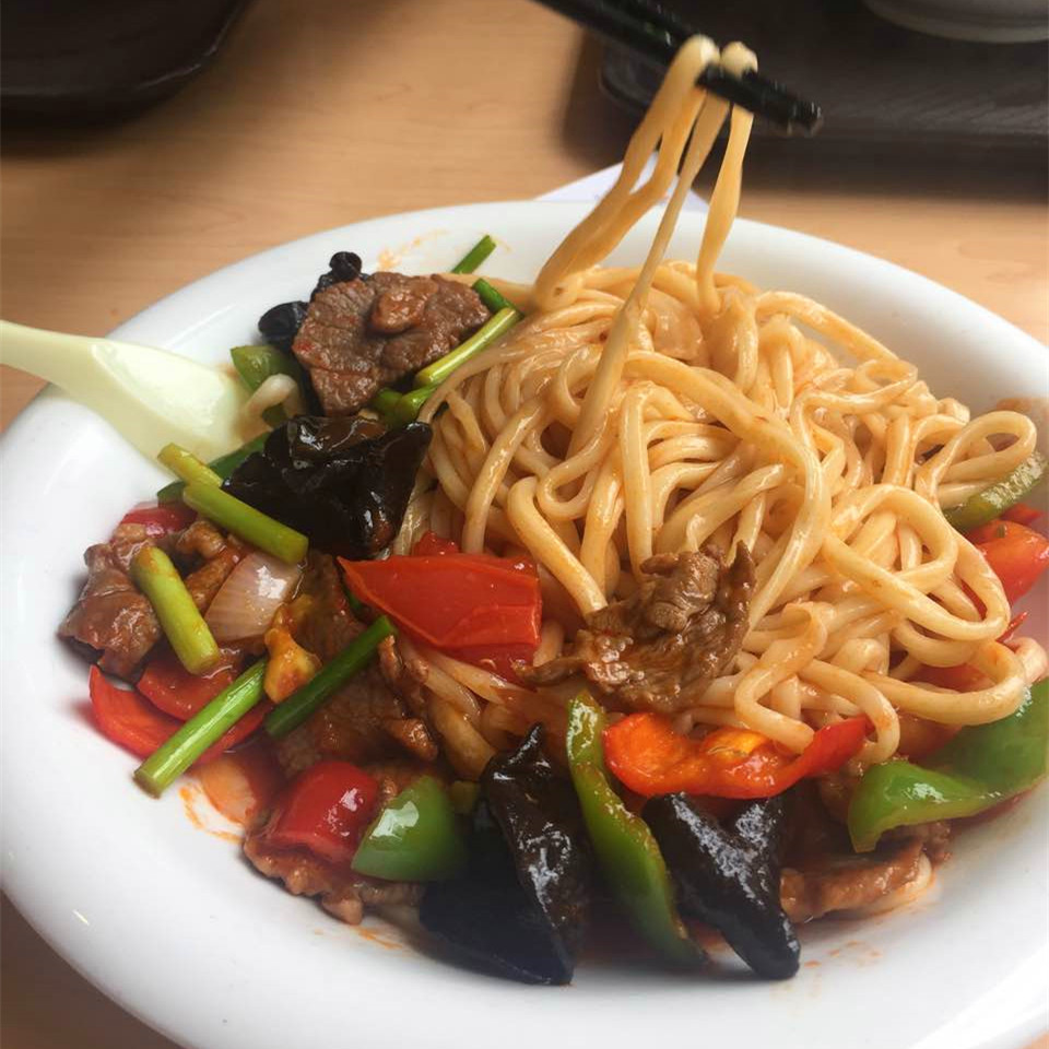 拉面出鍋后不帶湯,用刀切成類似“炮仗”的面條段,重新炒制而成,酸辣開胃。