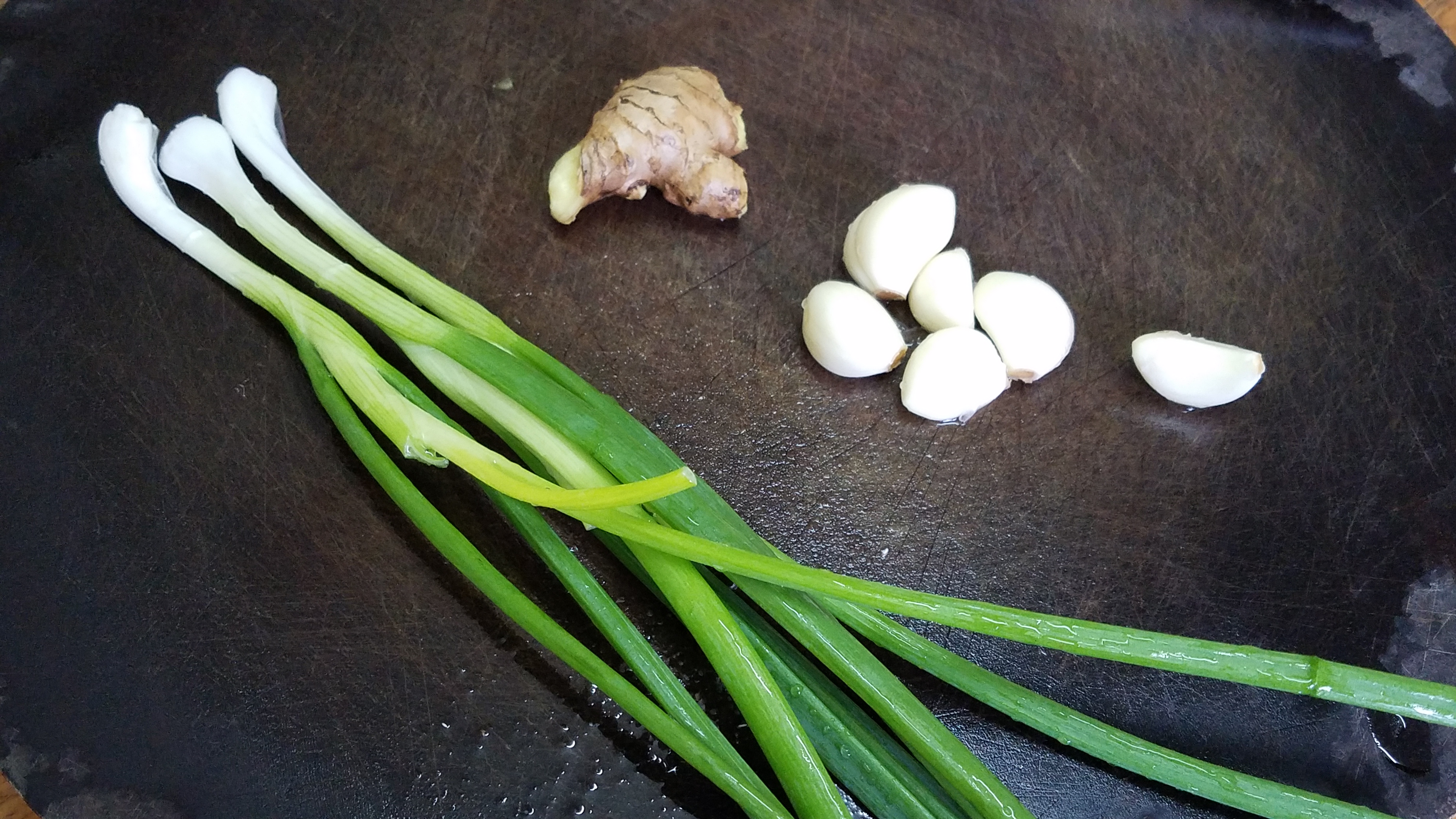 2.準(zhǔn)備好的生姜、大蒜跟蔥也都切好備用,大蒜可以用多一點哈。
