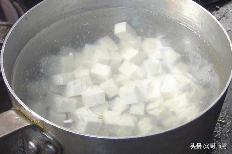 2、鍋內(nèi)加水,加入少許的鹽,加鹽能給豆腐增加一點底味,水開后下入豆腐,在煮豆腐的時候,勺子不要頻繁的攪動,水豆腐容易碎,水開1分鐘之后把豆腐撈出沖涼。