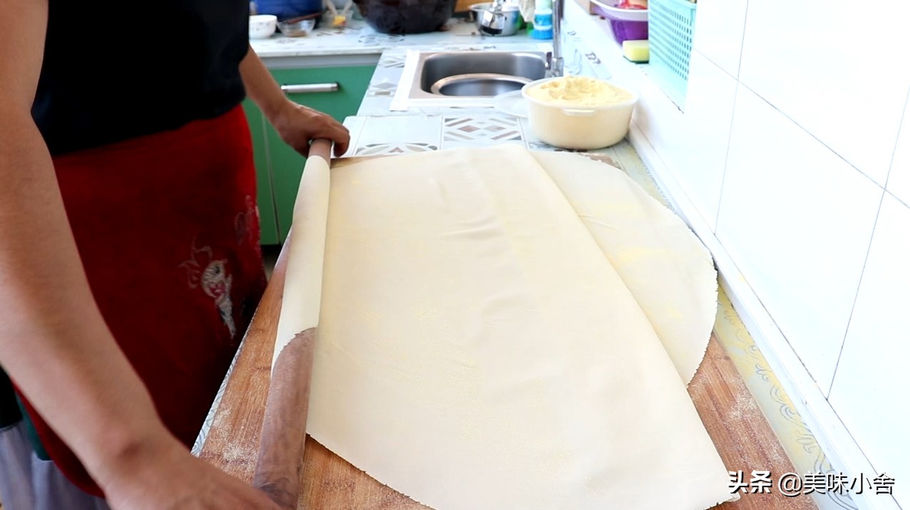 做手搟面有些人就是把面搟不圓、搟不薄。這里注意下,搟面的時(shí)候,平均每搟5-6下就換個(gè)方向繼續(xù)搟,而且先從邊上往中間搟,才能搟的薄厚均勻。