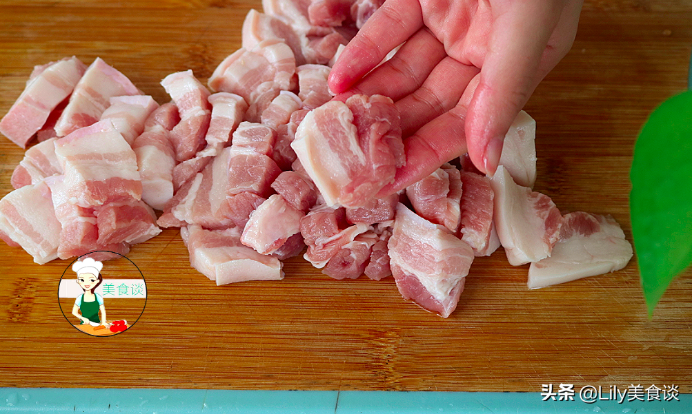 2、把五花肉切成小塊,這里切得比較小塊,大家也可以切成厚一些的方塊。