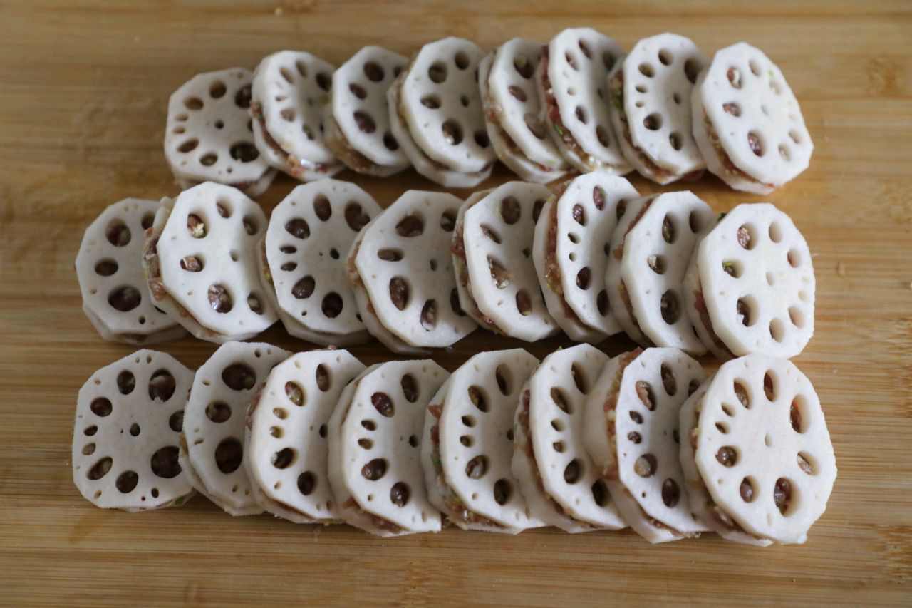 4、還有一種做法是將蓮藕切成厚一點的藕片,然后再從中斷切開,但是不切斷,把做好的肉餡塞入中間即可。