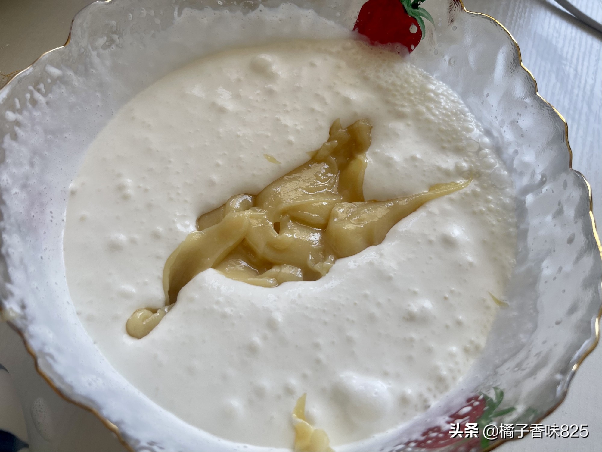 5、用電動(dòng)打蛋器攪拌淡奶油,稍微有點(diǎn)濃稠,就把奶糖醬也倒入淡奶油中,繼續(xù)打發(fā)至濃稠,而且還可以流動(dòng)的狀態(tài),也不要打發(fā)得太干,口感就沒有那么絲滑了,冰淇淋液就做好了。