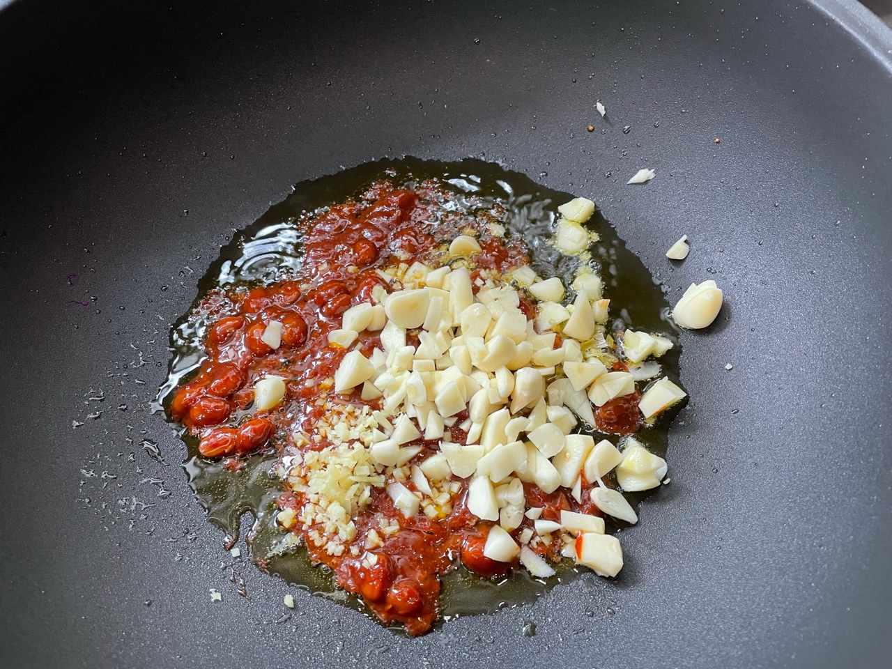 7、起鍋燒油,油熱之后放入豆瓣醬煸炒均勻,然后再放入姜末和蒜末炒出香味。