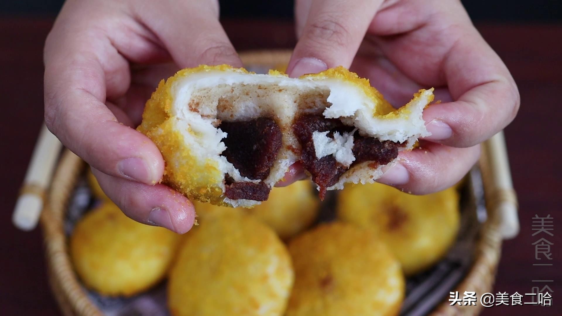 食材:水磨糯米粉400克、開水200克、清水80-100克、小蘇打2克、酵母粉4克、豆沙餡適量、雞蛋適量、面包糠適量