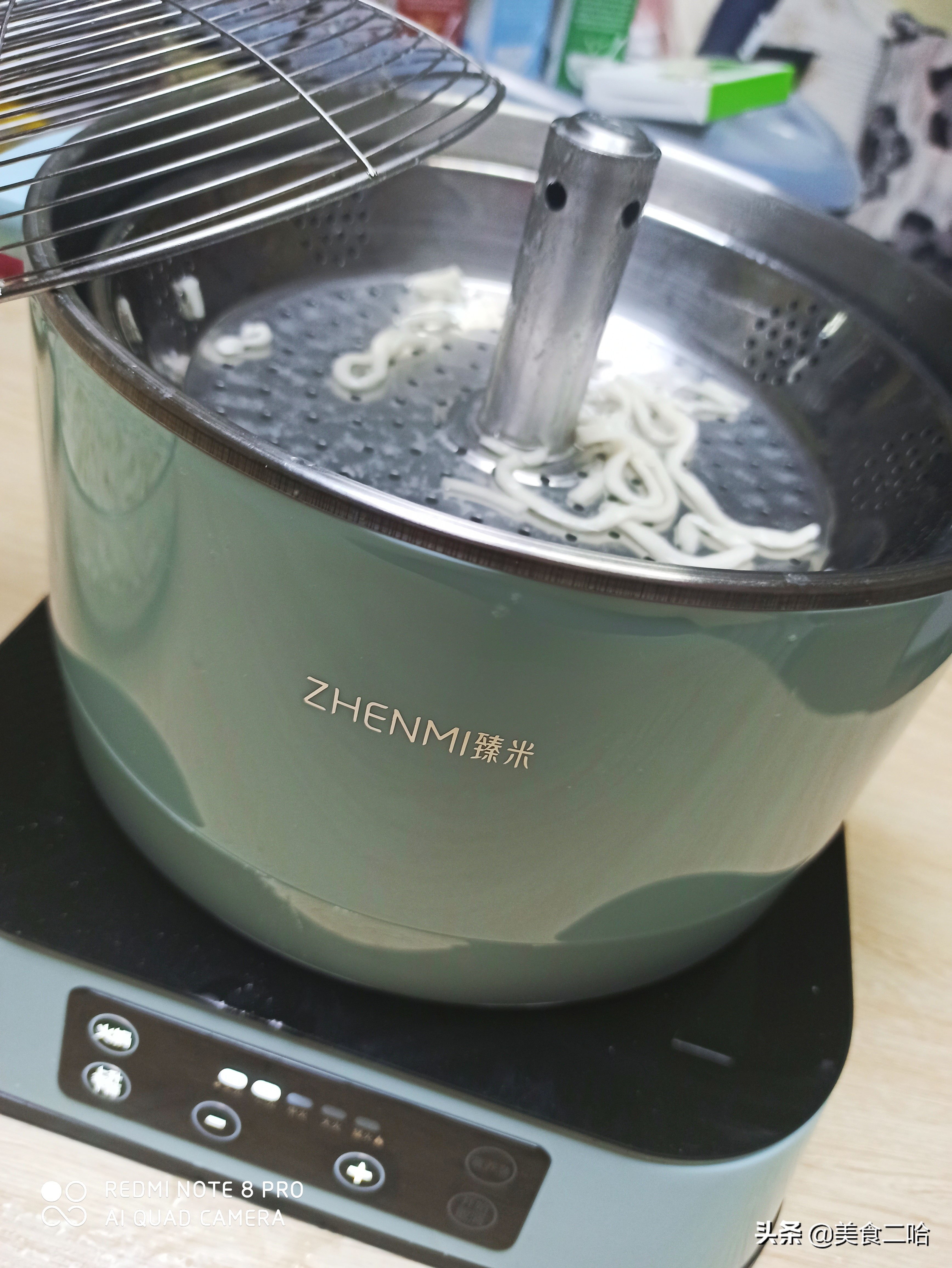 2、材料都準備好就開始煮面了,家里只有我自己在,不值當?shù)挠么箦仯晕姨匾庥昧苏槊椎淖詣由祷疱亖碇竺妫鸦鹆﹂_大最大不到5分鐘水就已經(jīng)沸騰了,下入一把鮮面條,然后火力改小一些,煮至沸騰就可以出鍋了,按一下升降鍵,面條就自動濾水了,特別方便。