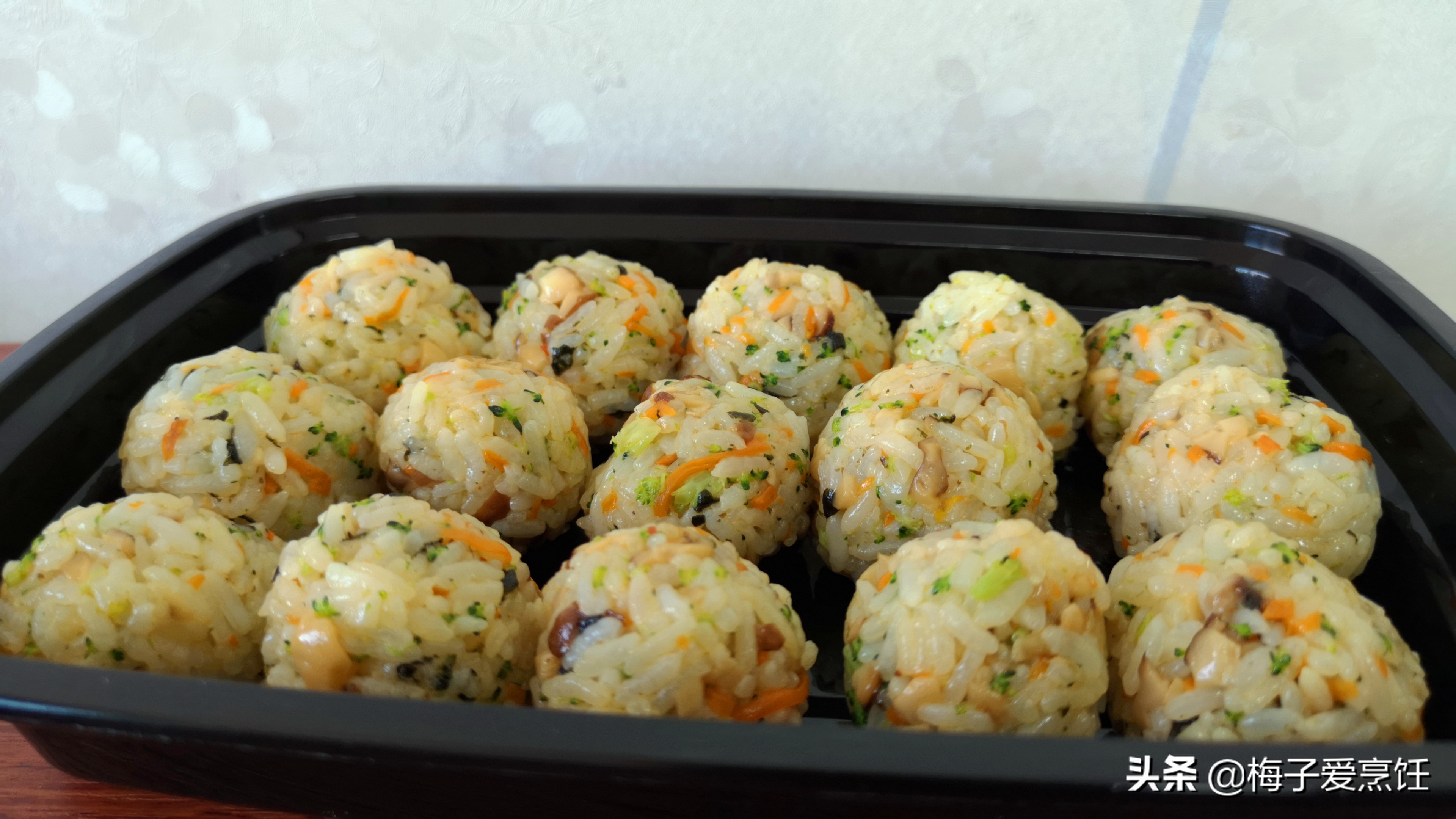 5、這個小飯團就算好了,軟糯Q彈,非常的好吃,要比壽司簡單,制作還方便,里面的配菜也可以隨意的添加,上班帶著當便當,出門野餐帶一點,吃著也方便。
