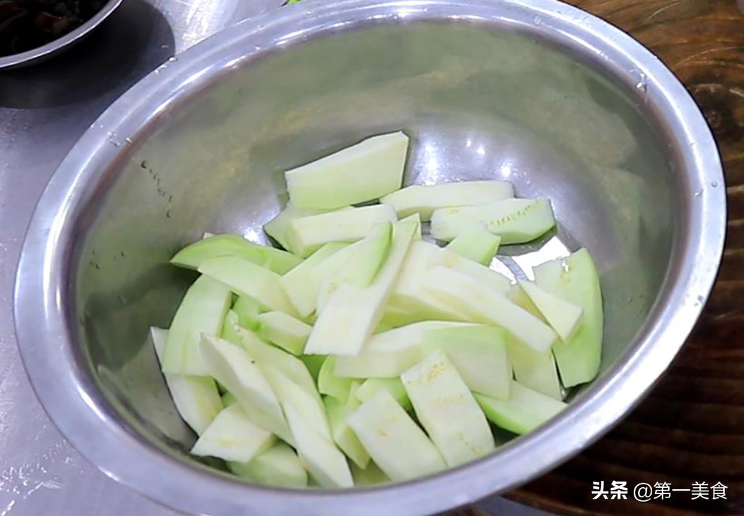 準(zhǔn)備青茄子一個(gè),削去外皮,先切成厚片,再切成菱形塊放入盆中。