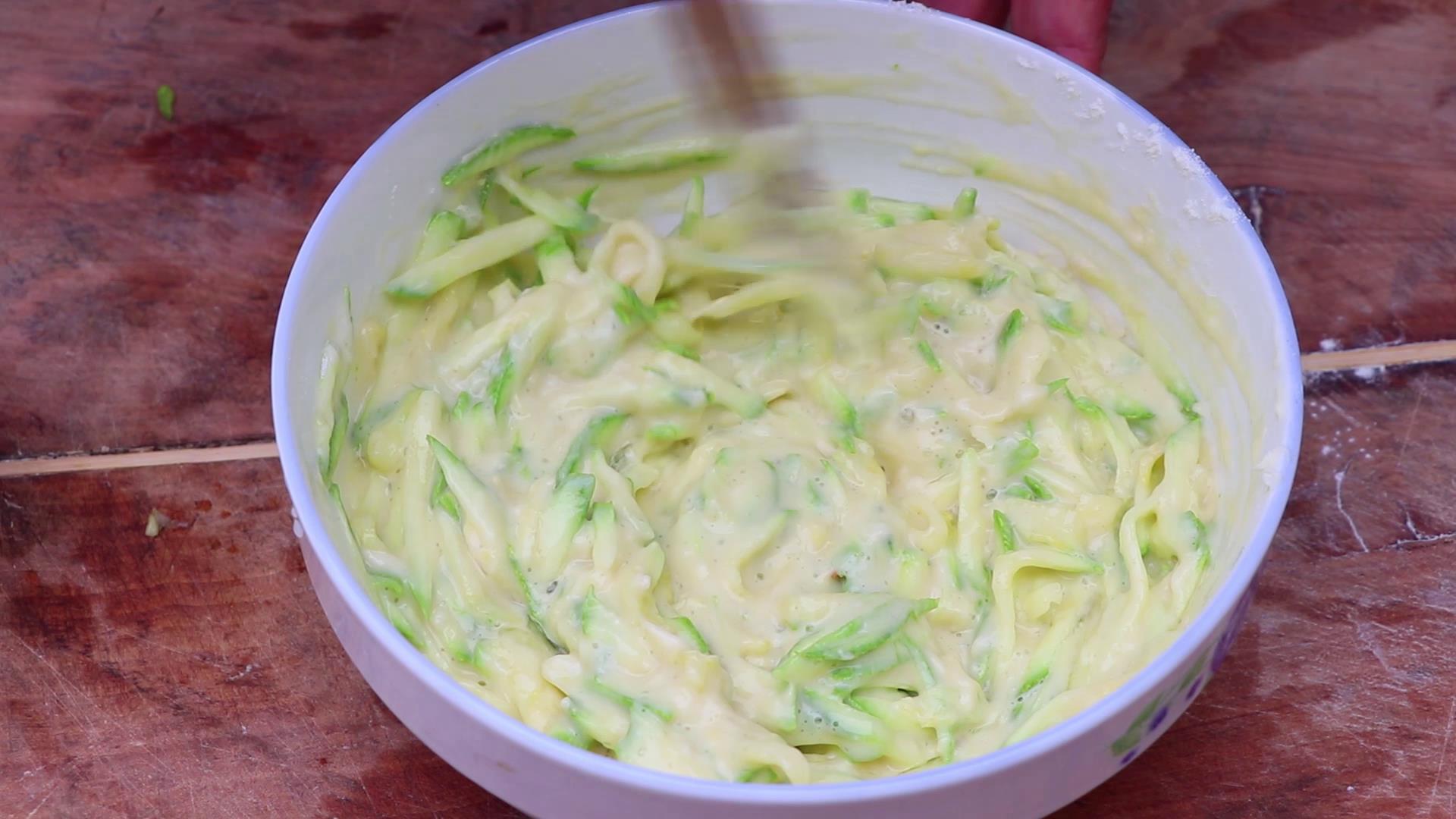 先準(zhǔn)備一個嫩一點的西葫蘆,掐頭去尾用擦絲器擦成細(xì)絲。處理好的,西葫蘆絲,我們放在一個碗中,加入適量的食用鹽,打入兩個雞蛋,再加入適量的面粉,再加入適量的清水?dāng)嚢璩梢粋€糊狀。