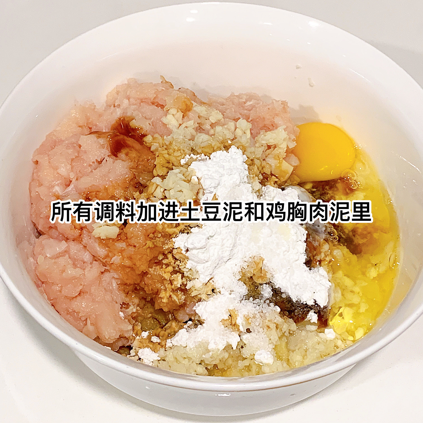 5??將所有調料和土豆泥雞胸肉泥攪拌均勻;