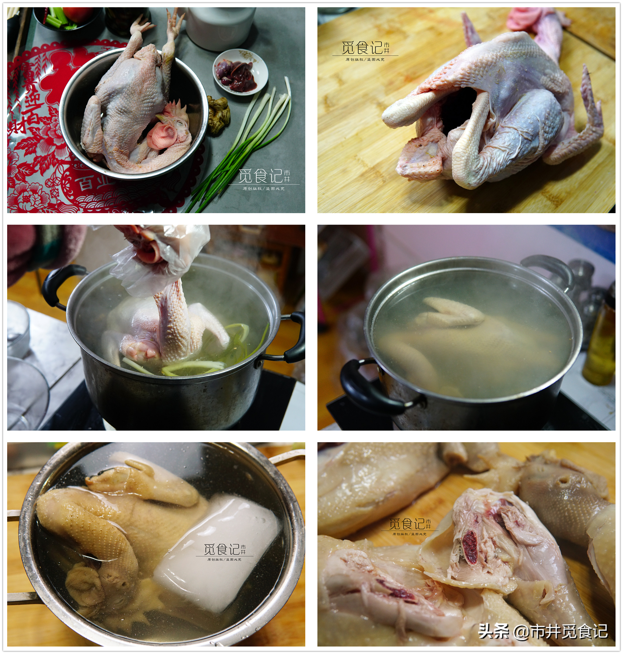 3、水大火煮開5分鐘以后,轉小火讓水冒小泡,然后就要開始“吊水”了,手拿著雞頭,把整個雞身子放在鍋中,往水里游一圈,時間大概10秒左右,然后提起來瀝水30秒,如此反復3次,雞的表皮基本已經熟了。