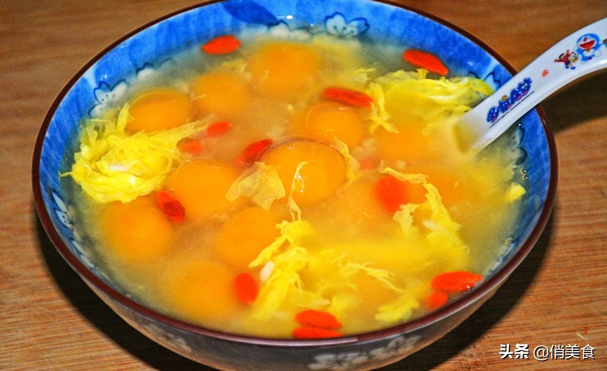 5、水開后下入小湯圓,再下入一些枸杞,煮至小湯圓飄起,2分鐘后加入3勺紅糖,2勺米酒。