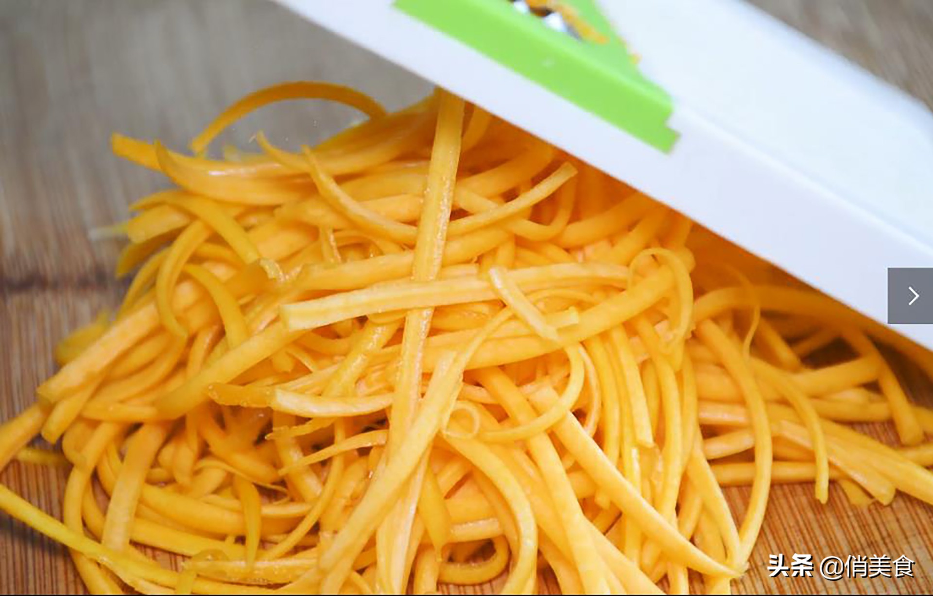 3、準備一大塊洗凈的南瓜,用擦絲器把南瓜刮成絲,南瓜絲不要刮得太細了。