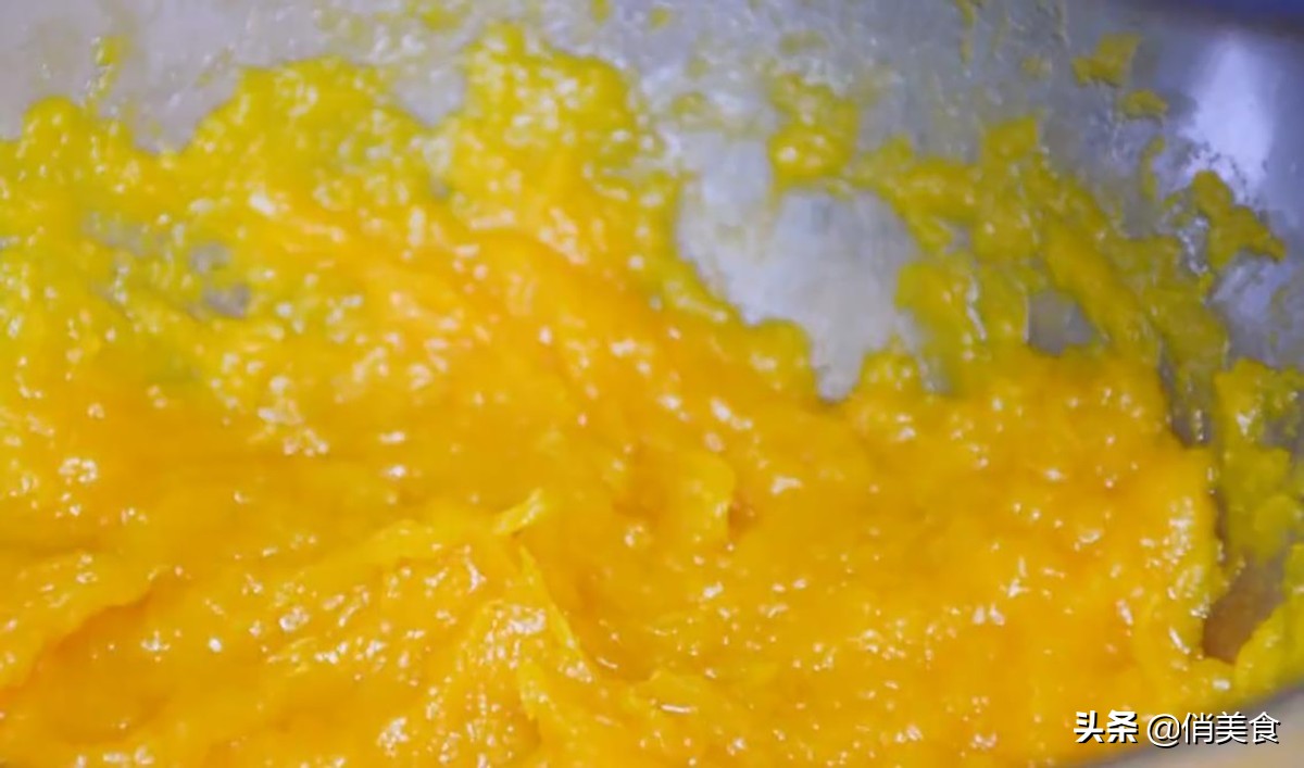1、南瓜切成薄片放入盤中蒸熟,南瓜蒸熟后取出放一個盆中,然后把南瓜搗碎按壓成泥。