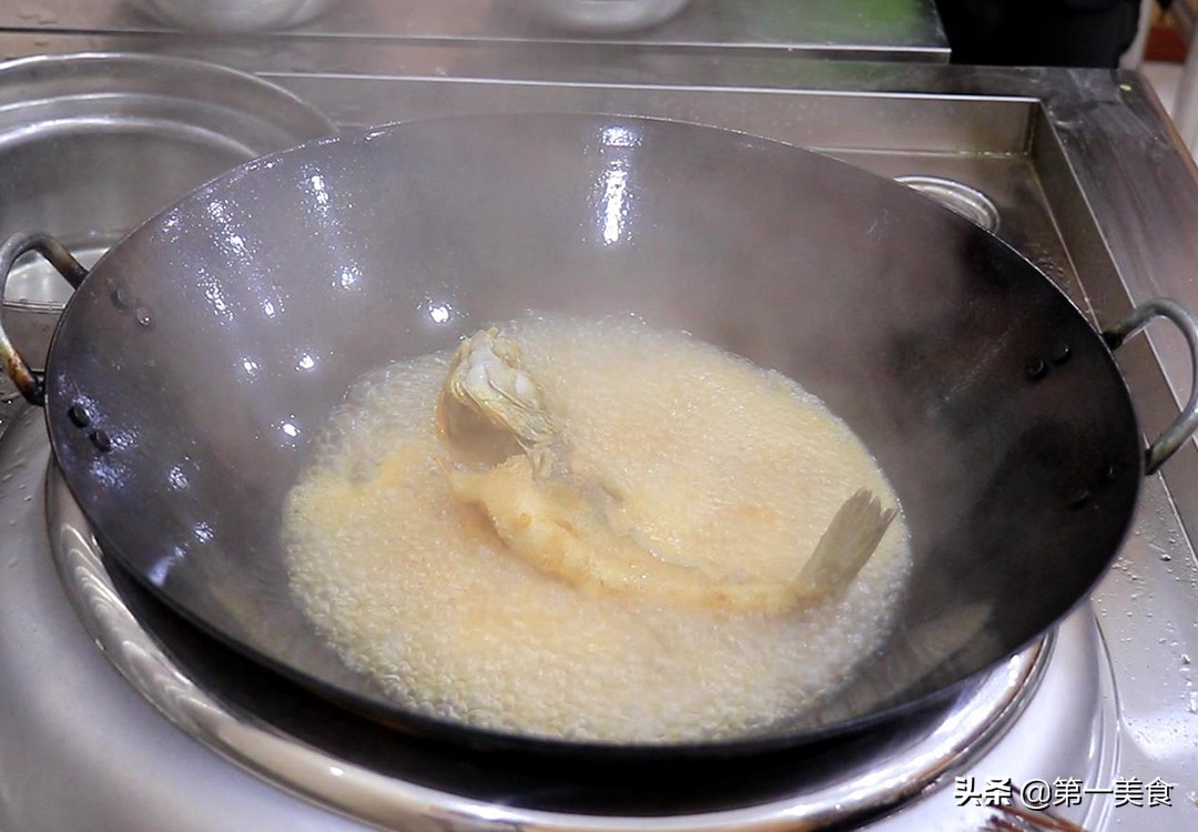 鍋內燒油,油溫五成熱時,把腌好的魚擠干料汁放入鍋中,開中小火慢慢炸,千萬不要翻動魚以免魚身破碎,大約炸五分鐘,把魚炸酥、炸透、炸成金黃色時撈出來控油。