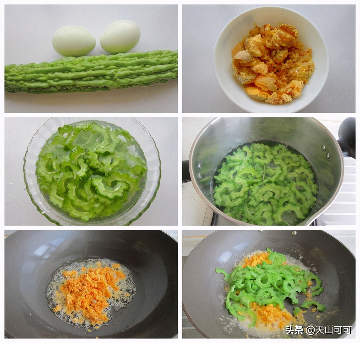 主料:苦瓜、蛋黃輔料:植物油、鹽做法:1、把蛋黃取出,用勺子壓碎,苦瓜洗凈挖出內瓤,切片2、把苦瓜片用淡鹽水浸泡8分鐘左右,撈起,煮鍋加水大火燒開,加幾點植物油、下苦瓜,煮開撈起用涼水過涼,瀝干水分3 、熱鍋涼油,油熱7成,下蛋黃,小火煸炒到蛋黃分開,開始冒小泡泡4、下苦瓜,快速翻炒,直到把蛋黃裹住苦瓜即可
