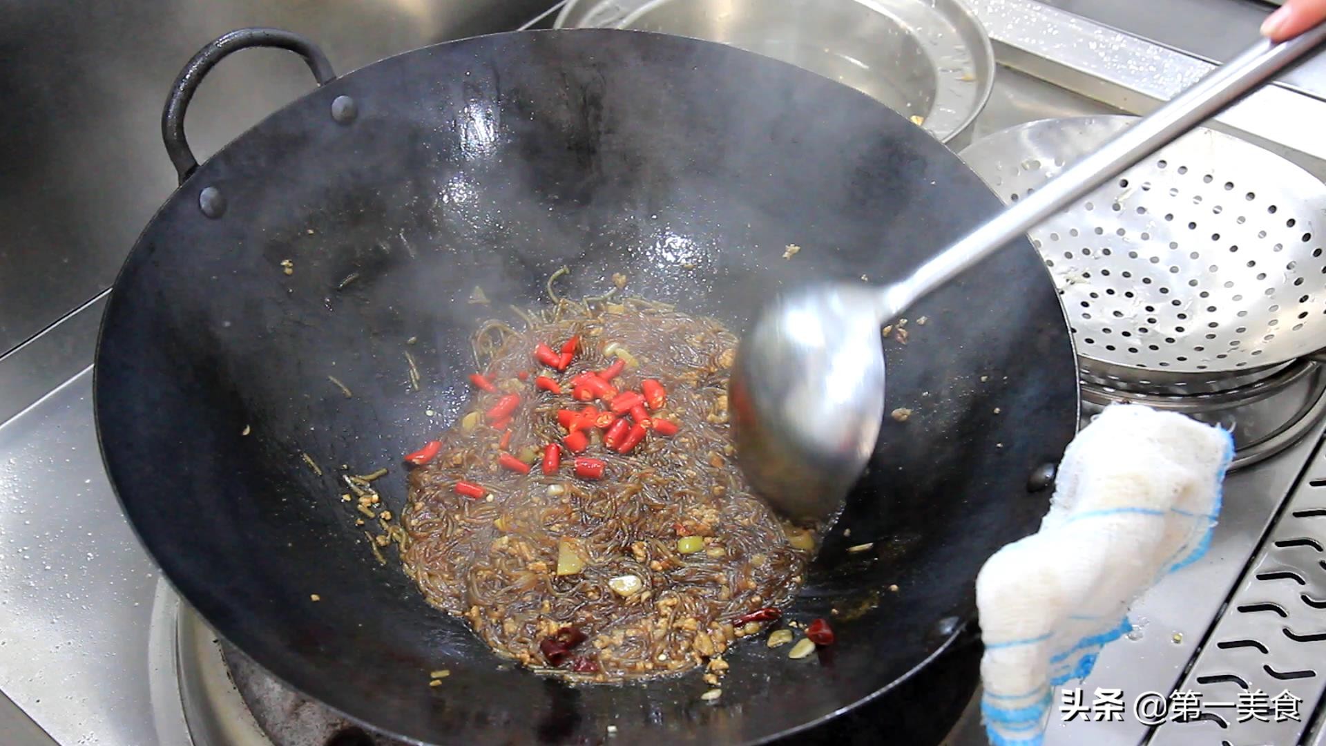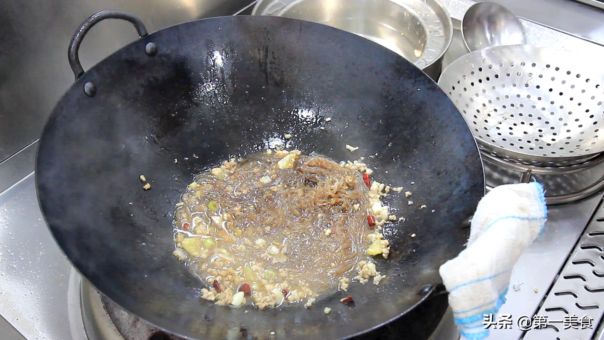 4.下面,我們開始烹飪,鍋內(nèi)燒油,油熱以后,放入蔥姜蒜和肉末一起翻炒,把肉末炒至變白,炒出豬油,抓入干辣椒1克繼續(xù)翻炒,倒入蠔油2克提一下鮮味,接著倒入適量的清水,放入粉條繼續(xù)翻炒。