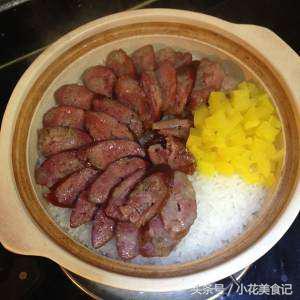 等水燒開,米粒吸干湯汁,加入香腸片,均勻蓋在米上,蓋上鍋蓋,轉小火慢煲。