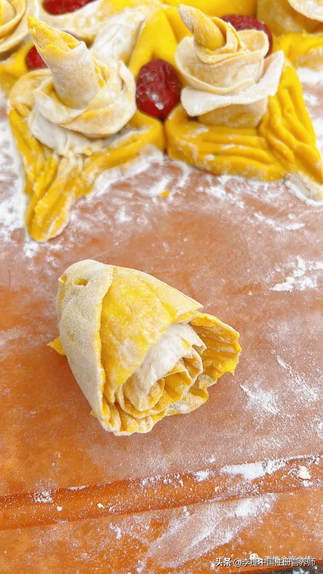 做五個餃子皮,別太薄,要厚一點,做個花心,中間用筷子壓一下。