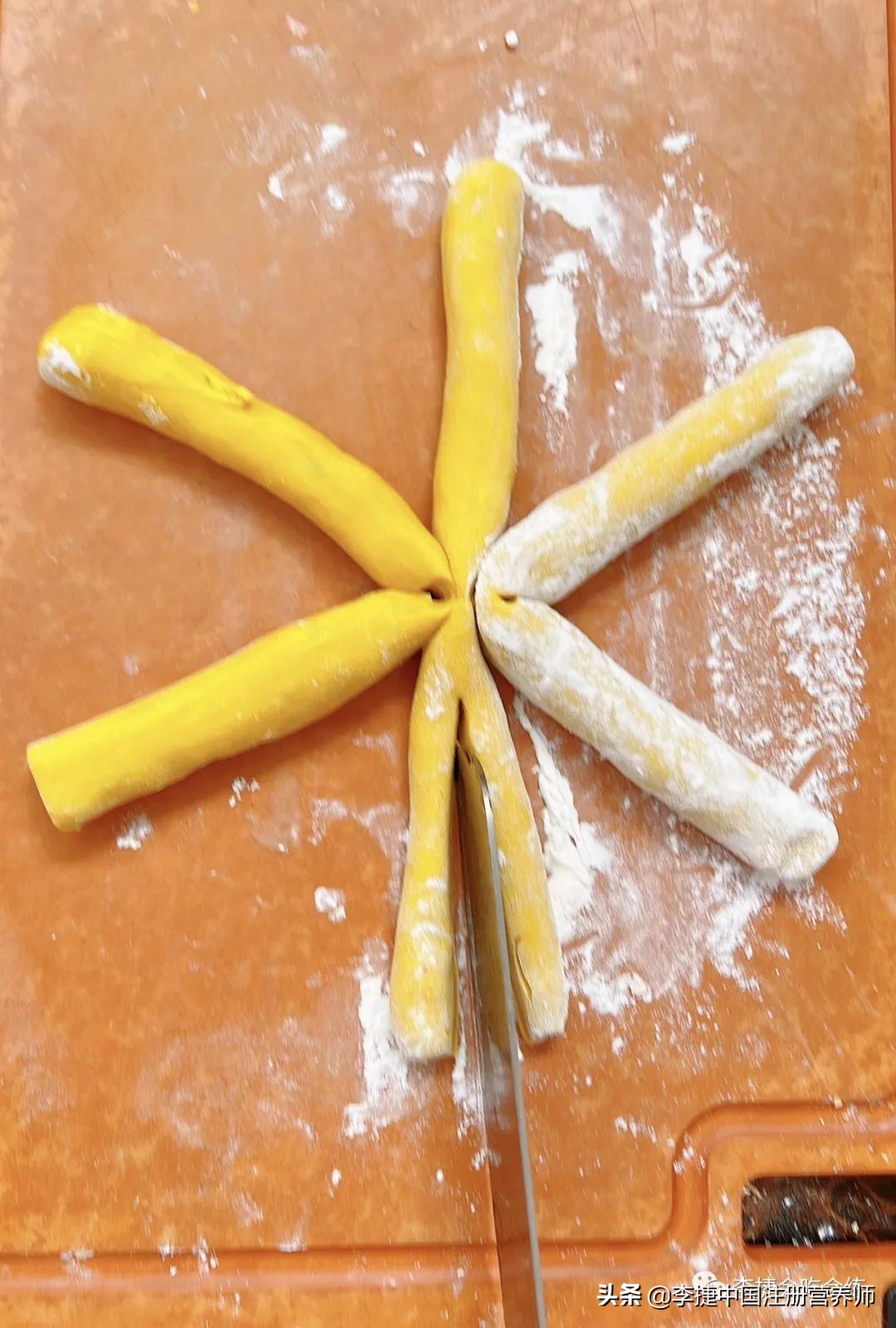我用白面200克加了一把蕎麥面,一個熟的涼涼的去皮貝貝南瓜,加了一個雞蛋,五克酵母,適量水和面發酵。因為貝貝南瓜的重量,每個家庭做起來是不一樣的,所以你就慢慢加一點水,因為南瓜里也有水分,所以不要一下子倒太多水。酵母是先用40度的溫水活化,然后再倒進面里面,一點一點加,和面的程度跟平時包餃子的面軟硬差不多就行了。可以發酵了。