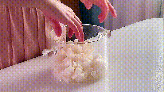 蘿卜洗凈切厚片再切長條后切成蘿卜丁放雙耳玻璃鍋里。
