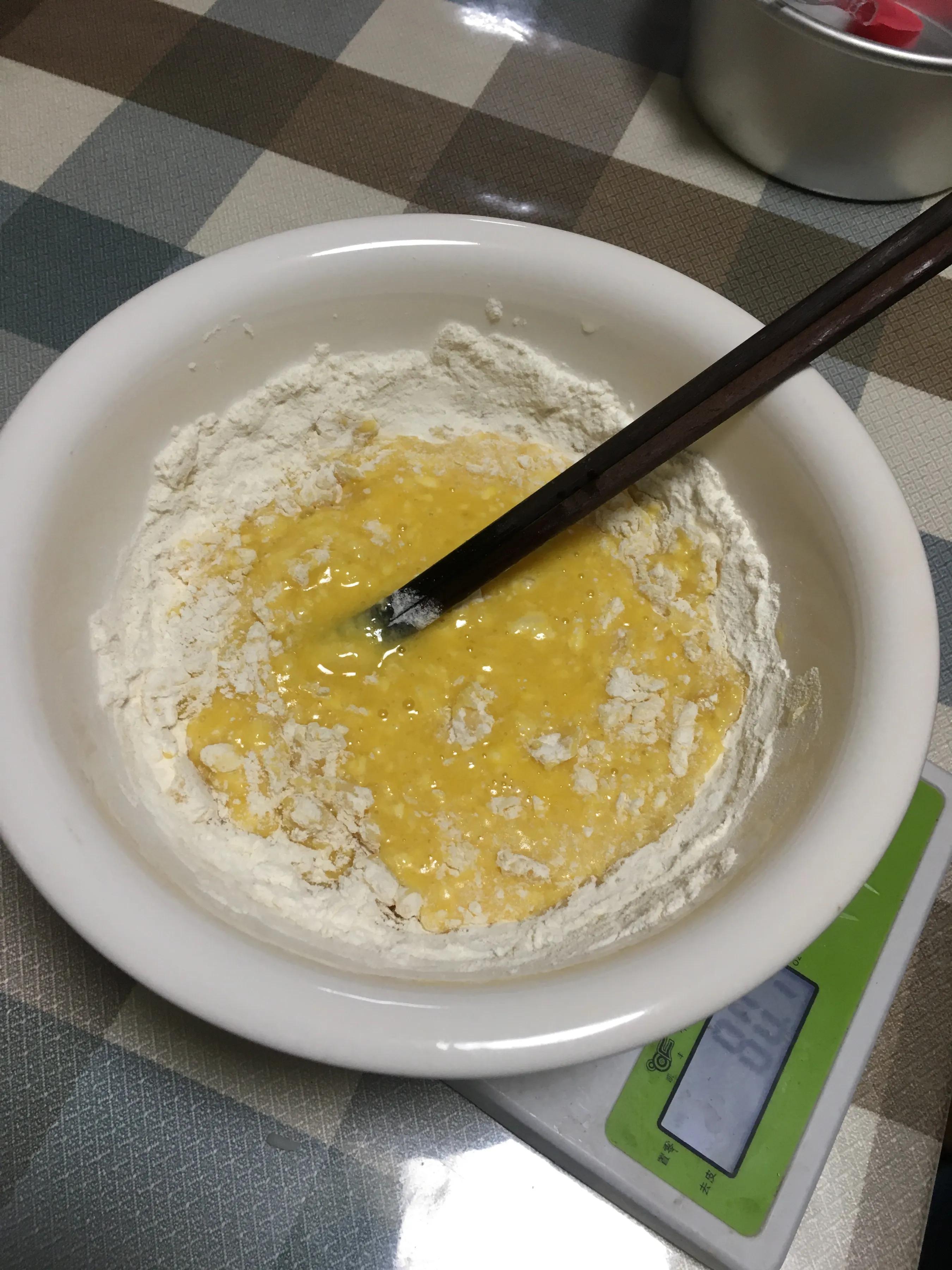 步驟:1、蛋清蛋黃分離后,將配方2-5的材料放入蛋黃處,攪拌時用Z字型,直到沒有顆粒成糊狀;像下圖一樣一起撈在一起