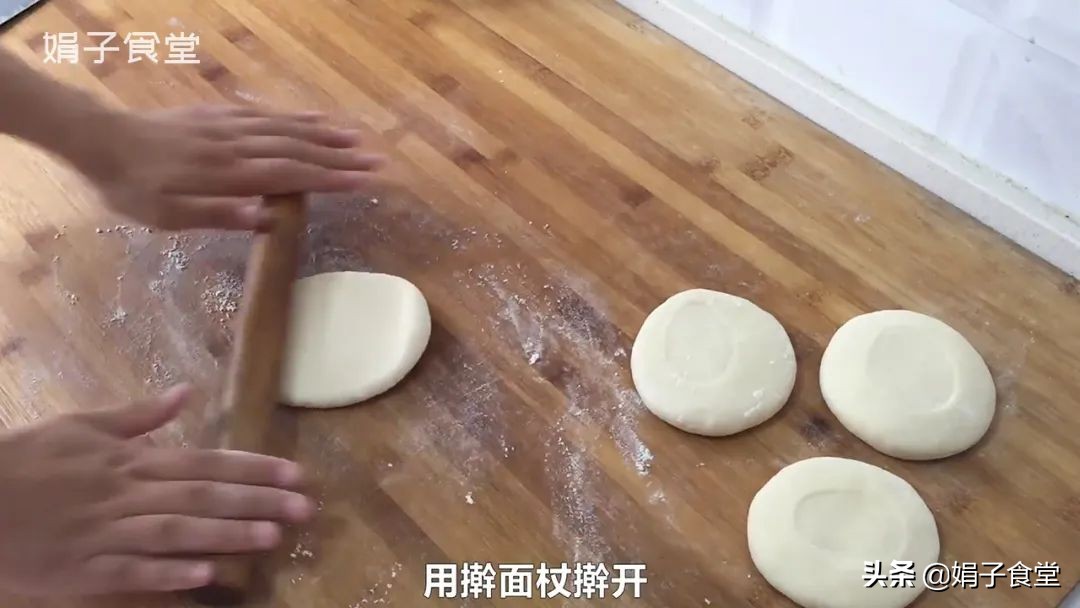 5.再撒一點(diǎn)干面粉,把劑子團(tuán)成圓形壓扁,然后用搟面杖搟成橢圓形。