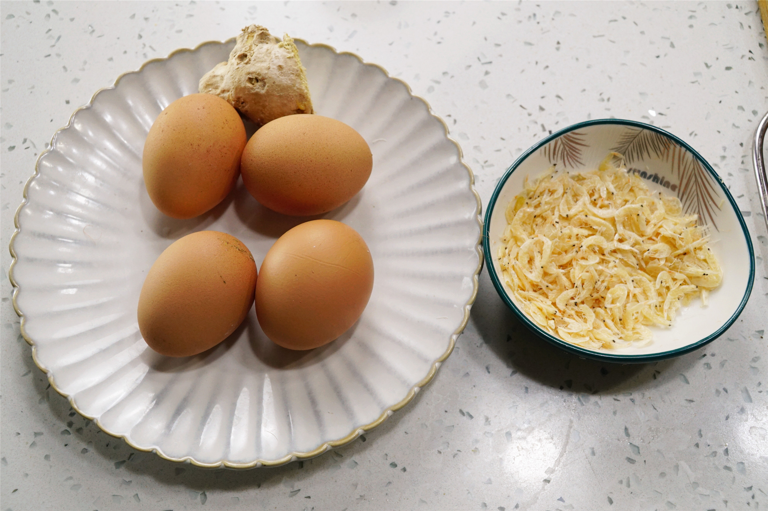 所用食材:雞蛋4個,干蝦皮2勺,姜一塊;生抽2勺,香醋2勺,糖半勺,淀粉半勺,鹽適量。