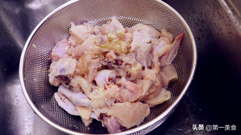 第一步:處理雞肉——我們準備三黃雞一只,去掉雞脖子上的淋巴,把雞肉剁成均勻小塊,雞屁股和雞腳趾也要去除,剁好以后 用清水多沖洗一會,洗凈上面的血水,然后把雞塊放在清水中再浸泡20分鐘,充分泡出里面的血漬,減少腥味 ~
