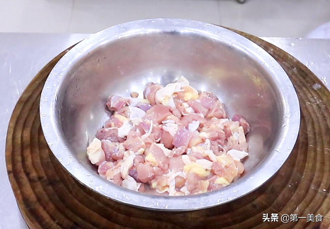 準備雞腿兩個,也可以用雞胸肉代替,把雞腿里面的骨頭剔出來,雞肉切成1厘米左右的小丁,雞皮不用去除,雞皮的夾層含有雞油,口感上會更滑嫩。