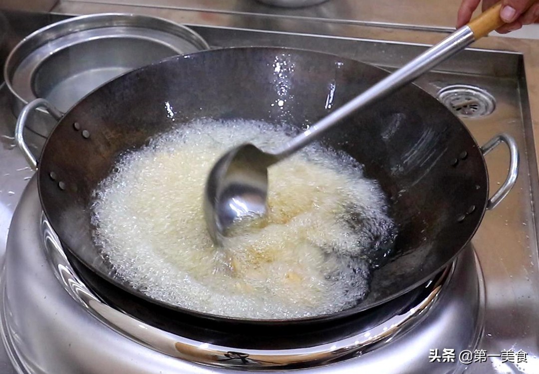鍋內燒油,油溫四成熱時,把雞丁倒入鍋中,用勺子輕輕地推散,全程小火滑油30秒鐘倒出控油,滑油的時間不宜過久,否則雞丁不夠嫩滑。