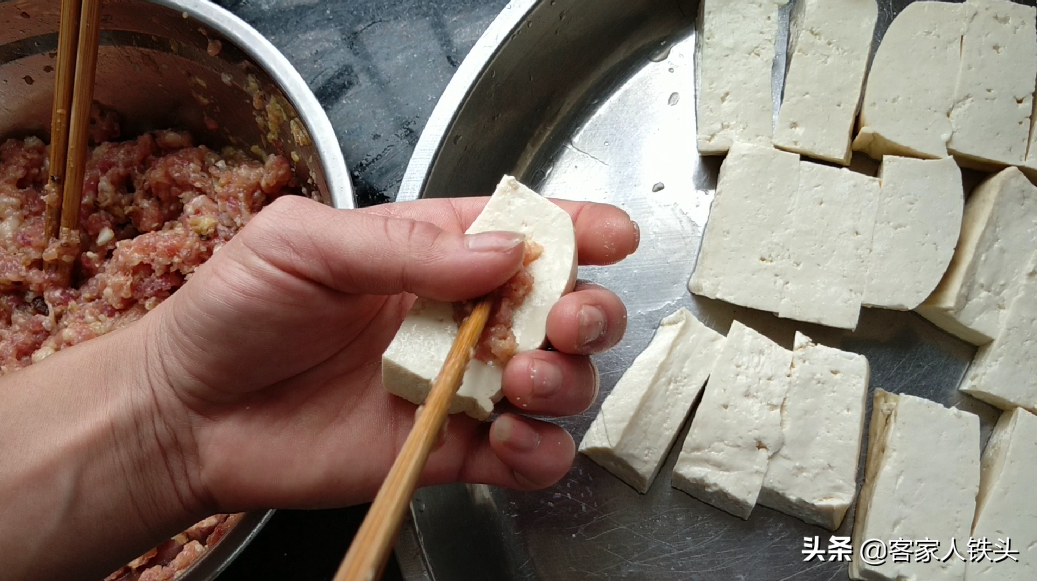 第五步:用筷子在切好的豆腐中間夾一下,口不要開那么大哦,很容易裂開的,然后就把肉餡灌進去,灌多一點點,這一步要小心一點,慢慢灌,一點一點灌進去