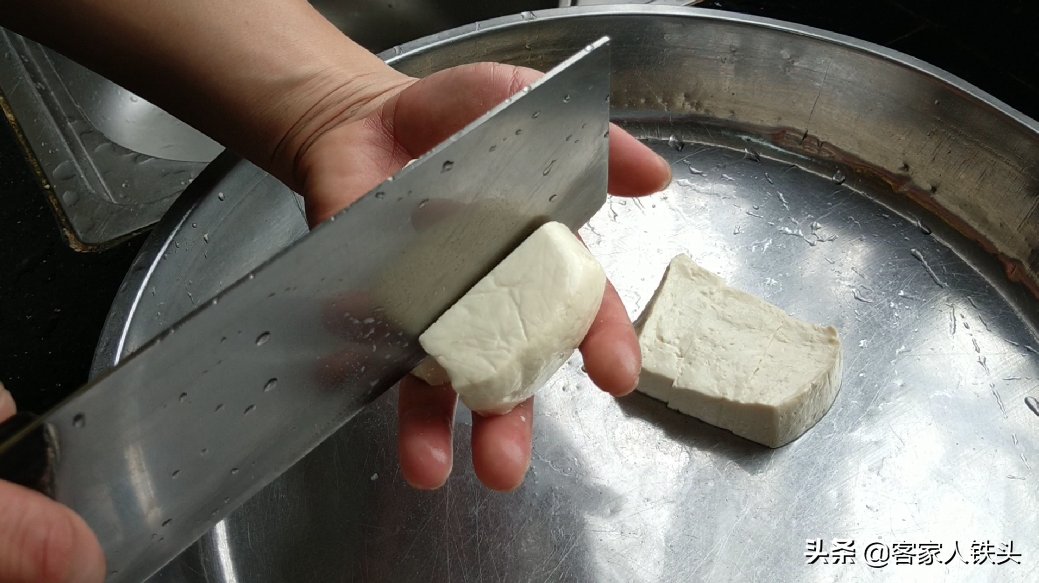 第四步:準備豆腐,我買的是鹽水豆腐,從小到大也只是喜歡吃鹽水豆腐,把豆腐一分為二,然后把它切成小塊,切成如圖大小差不多了