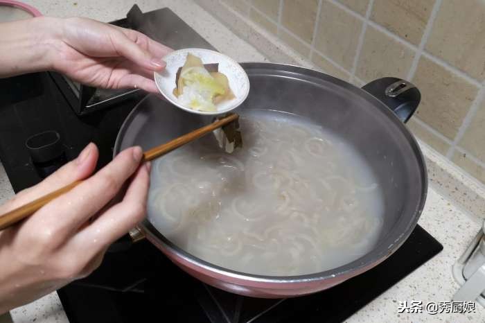 2.大火煮開(kāi)后,轉(zhuǎn)中火燉2分鐘,關(guān)火,撈入裝有溫水的盆內(nèi),過(guò)涼。