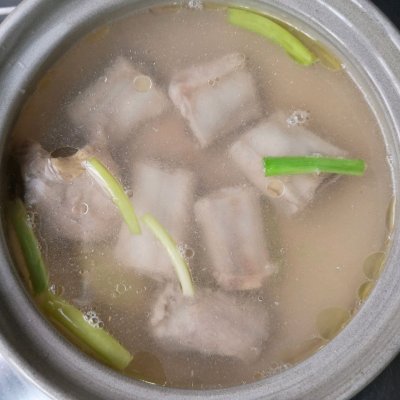 5、鍋中寬水放入蔥白和3片姜,將排骨冷水下鍋,加入1勺料酒。