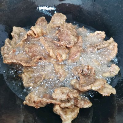 5、炸至變色氣泡變少,即可撈出。然后調中大火快速回鍋復炸控制時間比較短。(肉厚的復炸,我切的有點薄,復炸會硬)