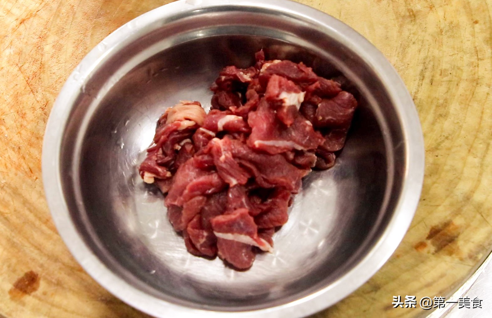 1.首先我們準(zhǔn)備一下食材,牛肉350克,頂著牛肉的紋路,切成均勻薄片,牛肉最好選牛里脊,沒有筋膜,肉質(zhì)軟嫩,頂?shù)肚谐龅呐H飧秸容^好嚼。