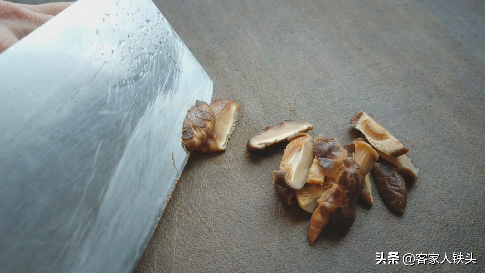第六步:提前準(zhǔn)備5朵干香菇,用熱水泡發(fā)后清洗干凈,再把香菇切薄片備用。