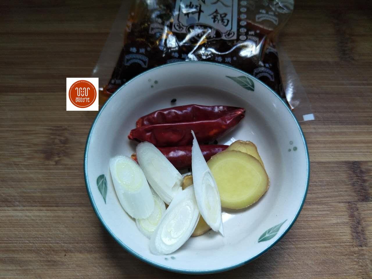3、再準備適量的鍋底料,干辣椒,蔥段姜片適量,如果喜歡吃麻,可適量加少量花椒。