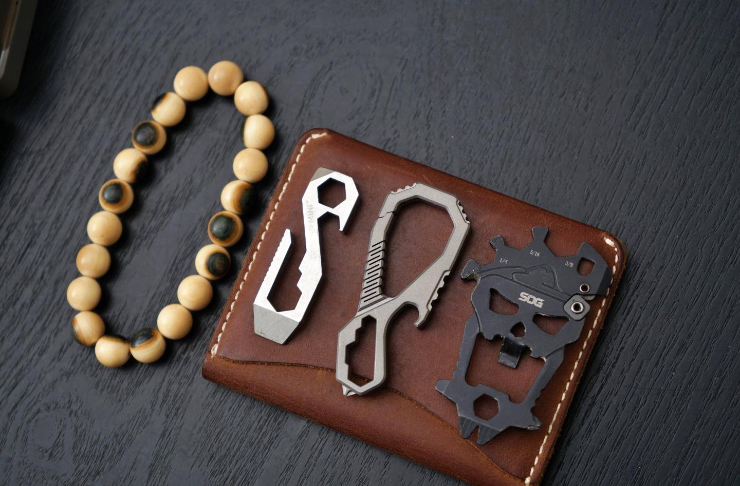 EDC小工具實際上也是近年來流行起來的小物件,比如SOG的骷髏頭小工具,其就集成了磨刀石、開瓶器、六角扳手、螺絲批、起釘器等近10多種功能,外形也很炫酷,不過由于棱角太多,并不適合當鑰匙扣使用。