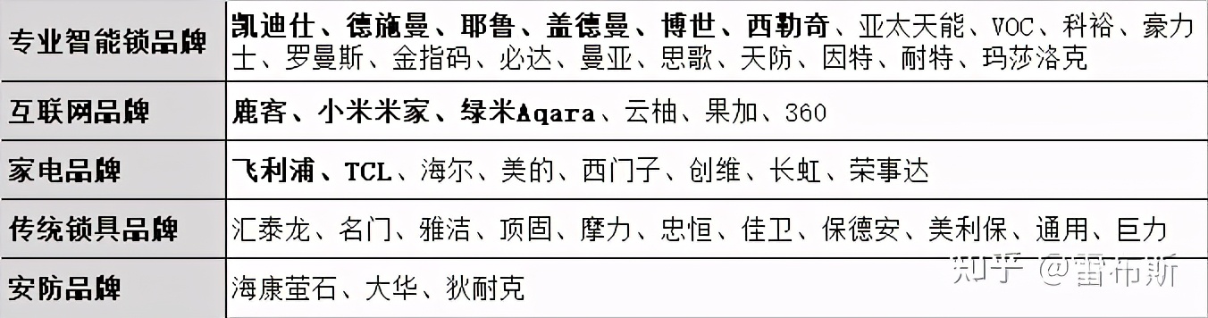 入門級:TCL、小米、綠米專業級:凱迪仕、德施曼、鹿客、博世旗艦級:飛利浦PHILIPS、耶魯Yale、西勒奇SCHLAGE、蓋德曼Gateman