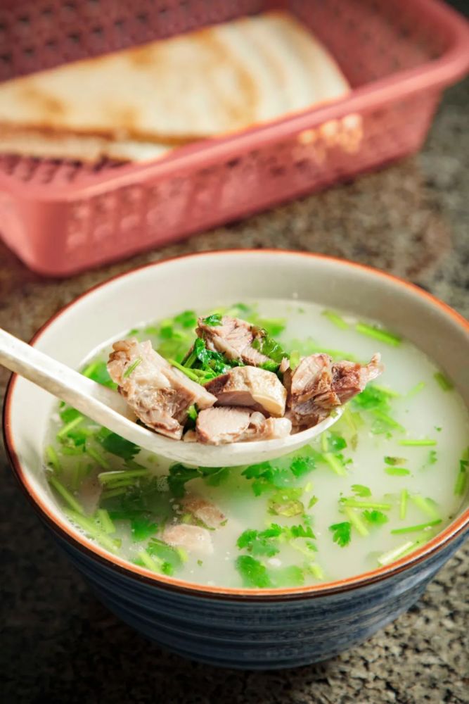 羊肉湯一定要配鍋盔,驢肉湯和餅絲是最強CP,胡辣湯比較花心,杠子油條、菜餃、雞蛋布袋、油餅,任意一種都可以(還有人揣個自家烙饃去喝湯的)